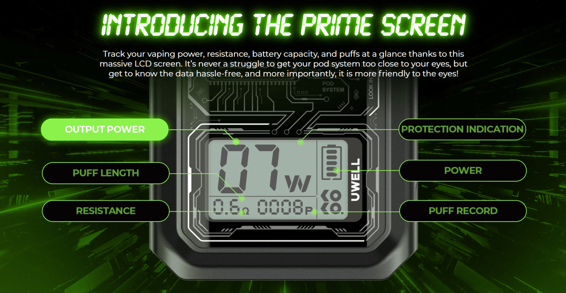 With the CALIBURN GK3, you can easily view your vaping power, resistance, battery capacity, and puffs.